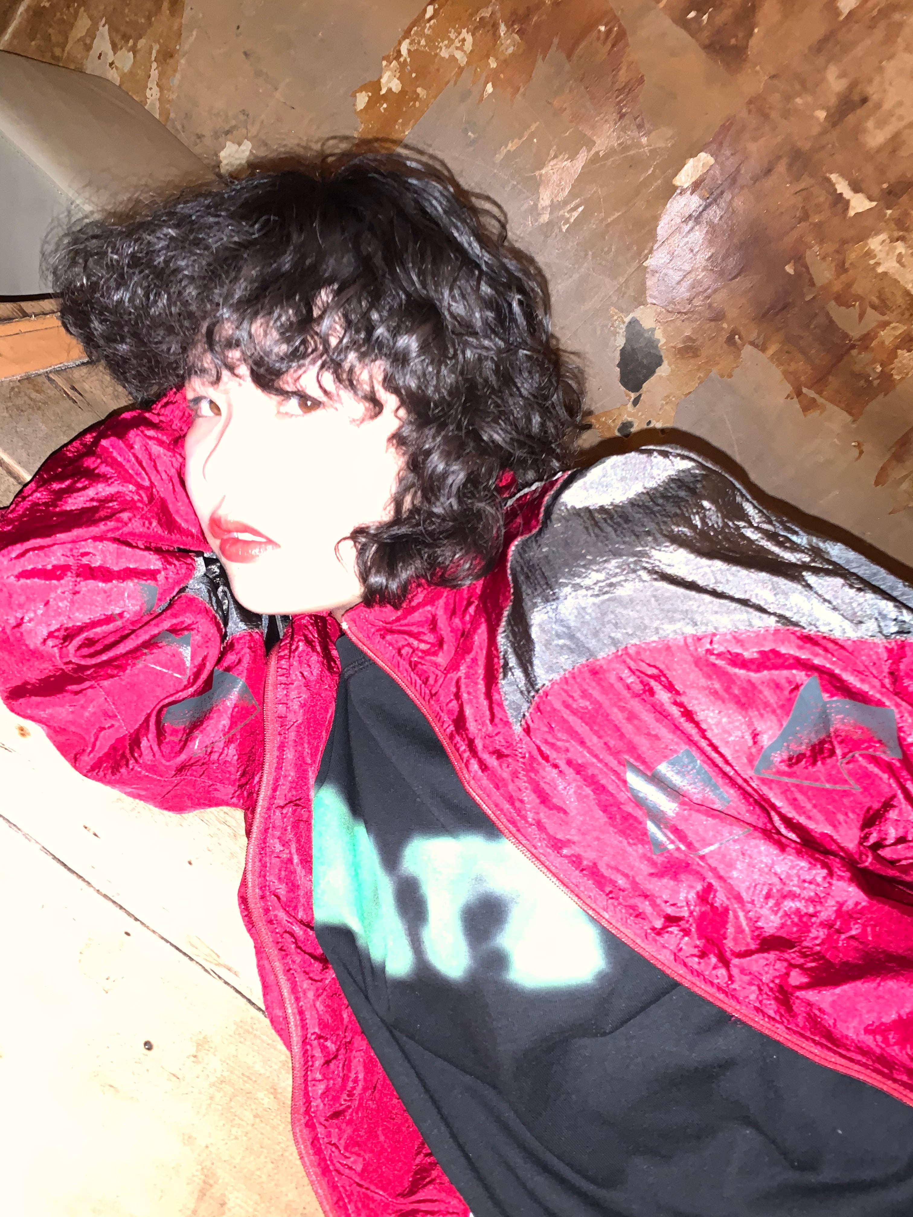 ポリエステルのシャカシャカ感にエンジ色とスペースグレーの色合いがクールな1着